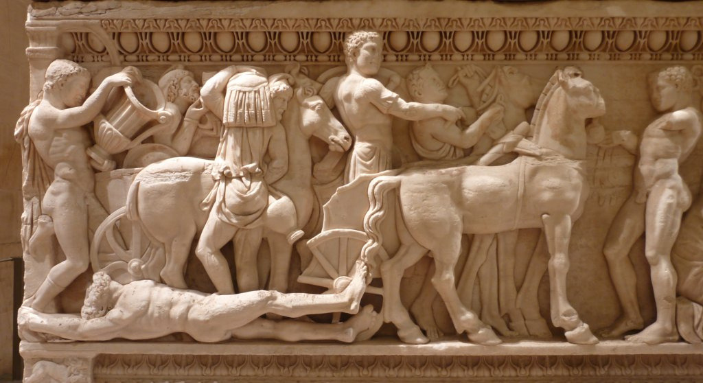 After he finally gets some unhaunted sleep Achilles takes more steps in mending damaged relationships with the Achaean army and its leaders. He holds funeral games for Patroclus. There are chariot and foot races. There are contests of martial prowess like wrestling, and archery. Most commentaries I’ve encountered spend little to no time on the funeral games, but I think they’re far more than mere formality or filler material. In them we see Achilles’ good humor blossom as he commands the attention of the whole army, arbitrates disputes, and Homer preaches the age-old wisdom that it is in fact better to give than to receive, as Achilles takes from his own treasures he’d been honored with over the years and redistributes his prizes of honor to others. There are numerous events that demonstrate Achilles’ character and growth, but I’ll examine one in detail. The outcome of the chariot race. It turns out Homer anticipates the drama of NASCAR racing by several millennia