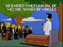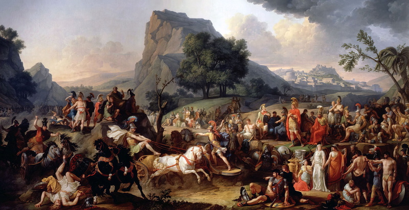 In one last gesture of kindness Achilles asks Priam how much time will he need to properly mourn and bury Hector, “One more point. Tell me, be precise about it— how many days do you need to bury Prince Hector? I will hold back myself and keep the Argive armies back that long.” Priam says that it will take 11 days, and Achilles assures him there will be peace. Hermes awakens Priam early in the morning, the return voyage is uneventful, and they cross the River Scamander at dawn. Priam assures his subjects they can venture outside the city walls to gather supplies on Mount Ida without fear of abuse and preparations are made. The Iliad ends with a description of Hector’s funeral.