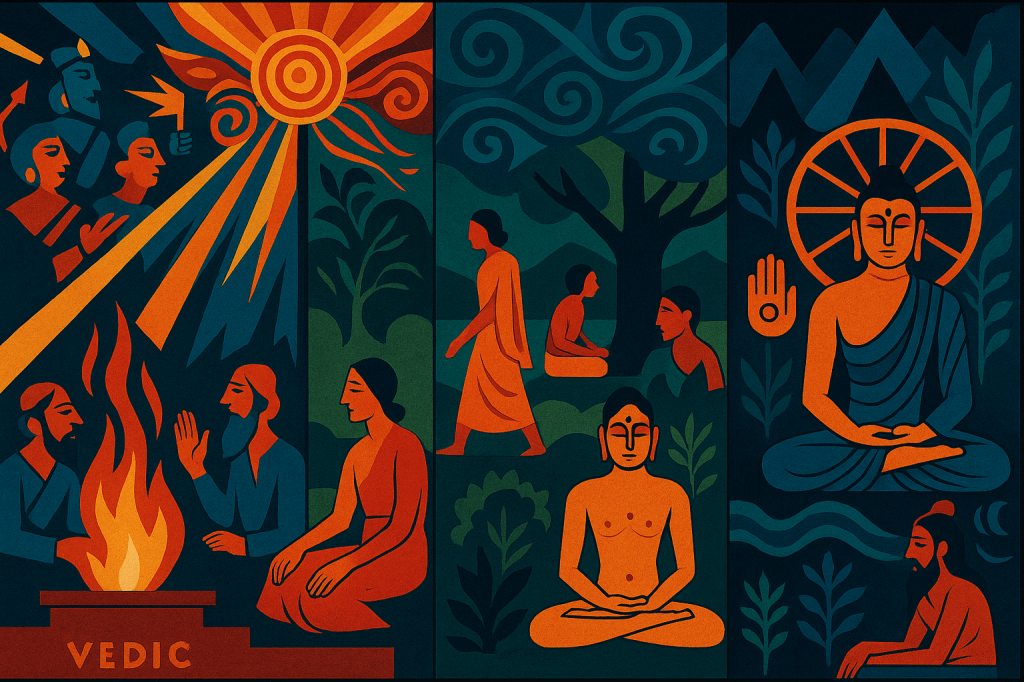 It seems reasonable to observe that each culture, religion, and philosophical school inherited its own pre-axial traditions and beliefs. It is no surprise that the specific questions and responses developed during this time also differ from place to place. When inheritors of the Vedic tradition asked themselves about meaning, morality, and the nature of reality there was an impressive blossoming. Three of the traditions developed in axial age India remain extant today: Hinduism, Jainism, and Buddhism. All three inherited a suite of beliefs that shaped their theology as either a springboard to expansion or a sounding board for refinement or rejection.