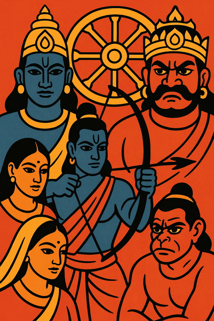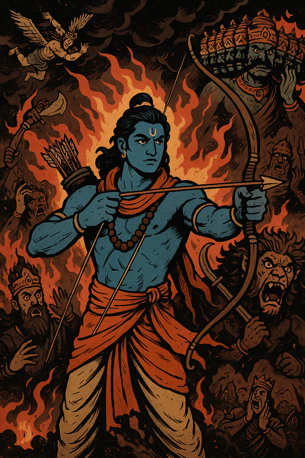 An army of monkeys and bears is gathered and an amphibious assault leads to a siege of Ravana’s golden palace. The war section is a great examination of Ravana’s character and the corrupting influence of power and the idiocy of sycophancy. While there is some drama, this is epic poetry, it’s a superhero story not tragedy, and the good guys win.