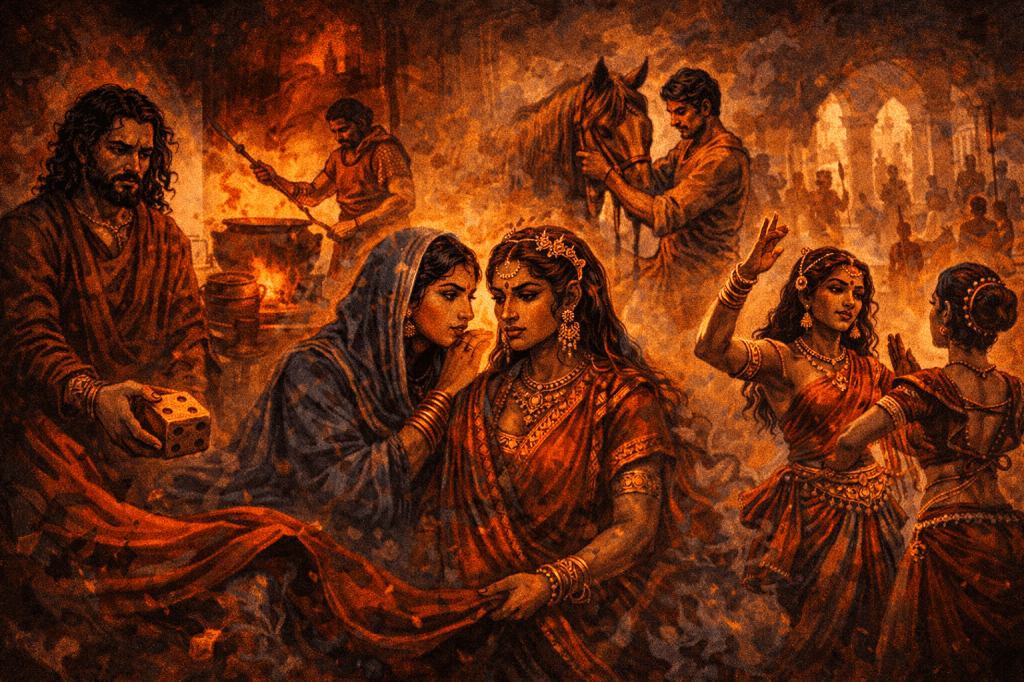 After the kerfuffle at the demonstration of martial skills that prompts Karna’s adoption, the division regarding succession in the kingdom becomes more public and Dhritarashtra decides it’s best the Pandavas leave town for a while to let things cool down. They relocate to Varanavata. Duryodhana hires a man to build a house secretly composed of highly flammable materials for the Pandavas to live in while there. The plan is to burn the house while his rivals are asleep inside. They catch wind of the plot and dig a tunnel which allows them to escape. The Count of Monte Cristo and Andy Dufresne would be so impressed. Attempted Murder is now on the Pandavas’ list of grievances. Since there’s a target on their backs they decide to live in disguise and not to return home immediately.