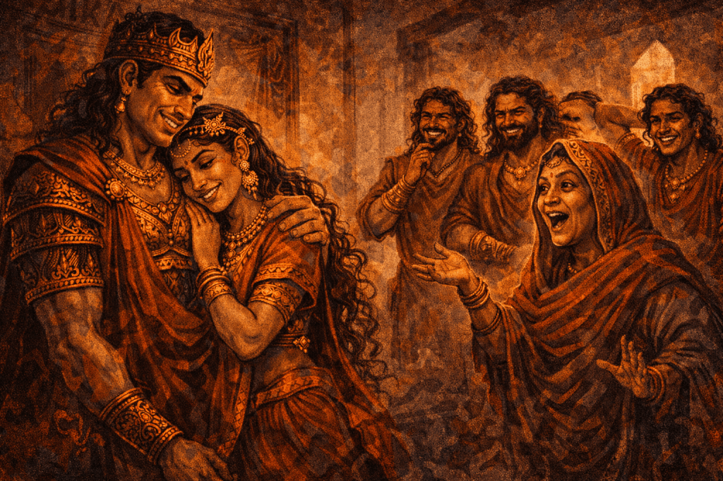 While the Pandavas are laying low they find out a beautiful woman, Draupadi, is hosting her swayamvara (contest to win her hand in marriage). The brothers decide to check it out. To win the fair lady’s hand, as is the case with alarming frequency in ancient epics, one must win an archery contest. See: The Odyssey, The Ramayana, and Disney’s Robin Hood cartoon. Arjuna decides that since any and all are welcome to try their hand in the contest, that even lacking his princely entourage he wants to give it a go. He wins and his new bride accepts him even in his beggar’s garb. In a farcical scene, when he brings his new bride back to the family hideout his mother hears that Arjuna has brought a prize back from the archery contest and without knowing what or who it is she insists that the boys share it equally. Draupadi takes a look at the five brothers and agrees and everyone just kinda shrugs and says, “I guess mom knows best?‽!”, the laugh track sounds and Draupadi marries all 5 brothers.