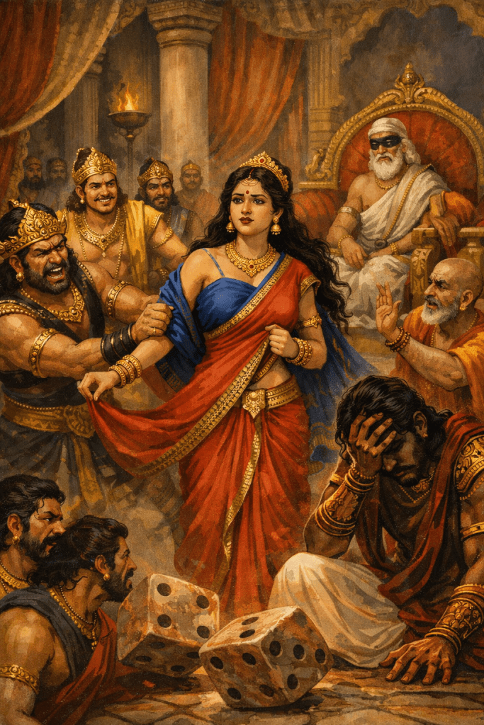 Not to be outdone the Kauravas build their own bigger, better palace and invite The Pandavas to visit. Here we learn of Yudhisthira’s feet of clay. Duryodhana challenges him to a game of dice. The dice are loaded and Yudhisthira goes on a losing streak of epic proportions. He gambles away all his property and wealth, and goes so far as to land himself, his brothers, and their wife Draupadi in servitude to the Kauravas. In a gesture of good will Dritirarastha forgives the debt and all is restored. However Duryodhana immediately challenges him again and the exact same thing happens. This time Duryodhana will not be denied and there’s a scene where Draupadi is humiliated and publicly stripped of her fine clothing to mark her as a servant. Led by an in-law of the Pandavas named Krishna, the assembled aristocracy erupts in revolt.