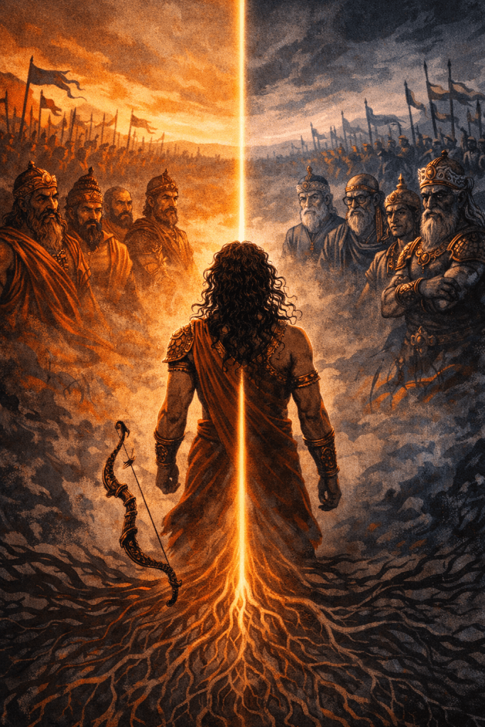 “Arjuna saw them standing there: fathers, grandfathers, teachers, uncles, brothers, sons, grandsons, fathers-in-law, and friends, kinsmen on both sides, each side arrayed against the other. In despair, overwhelmed with pity, he said: “As I see my own kinsmen, gathered here, eager to fight, my legs weaken, my mouth dries, my body trembles, my hair stands on end, my skin burns, the bow Gandiva drops from my hand, I am beside myself, my mind reels. I see evil omens, Krishna; no good can come from killing my own kinsmen in battle. I have no desire for victory or for the pleasures of kingship. What good is kingship, or happiness, or life itself, when those for whose sake we desire them—teachers, fathers, sons, grandfathers, uncles, fathers-in-law, grandsons, brothers-in-law, and other kinsmen—stand here in battle ranks, ready to give up their fortunes and their lives?” (1:27-34)