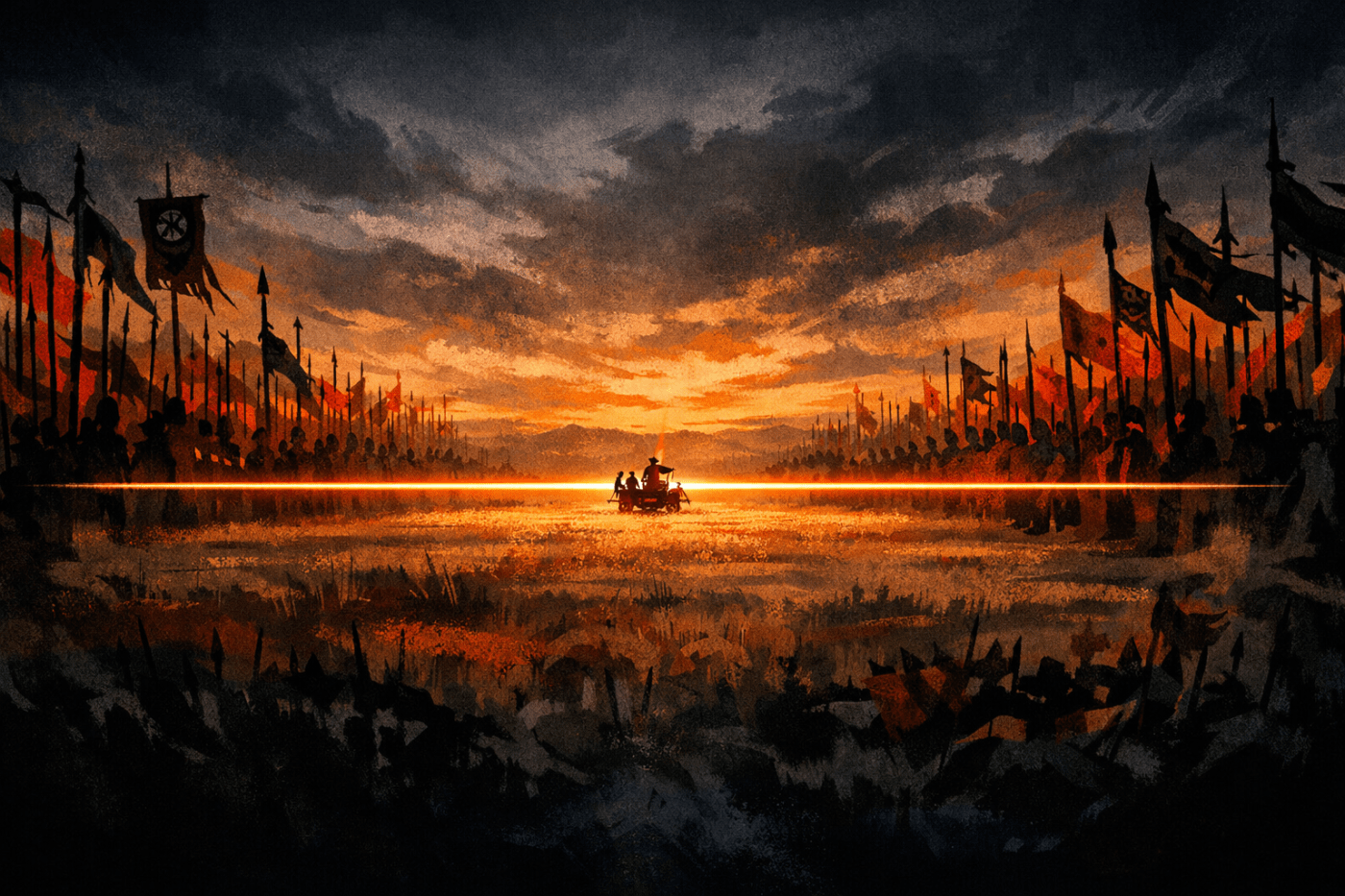 One afternoon in ancient India two armies gathered across a field near Kurukshetra. Following a series of horn blasts innumerable hosts stand in formation with standards raised and weapons drawn. The tension is palpable, yet the battle will not begin until the leader of the smaller force calls to attack. He is absent from the line. Instead he and his charioteer are stationed in the middle of the battlefield locked in debate.