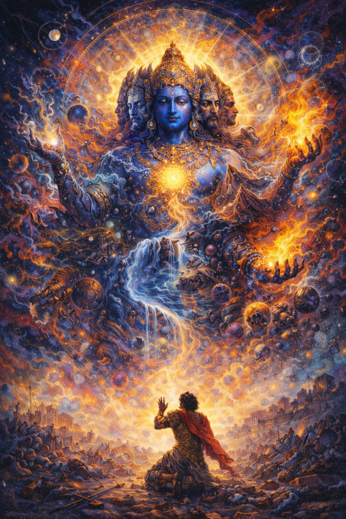 I mentioned that these arguments are presented by a god with Krishna serving as an avatar of Vishnu. It turns out that in The Gita, Krishna is more than “just” a god when he presents this argument. In the middle of the text, he reveals himself as the entirety of the universe: he is existence and non-existence, he is the physical reality and the natural forces that create and sustain life.