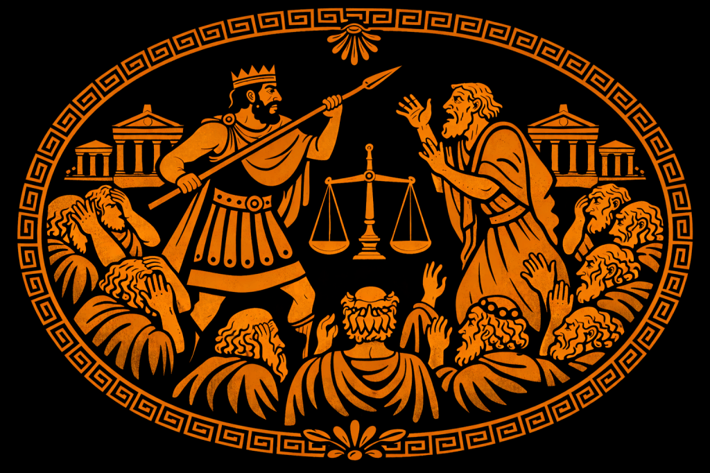 In Sophocles’ Oedipus, the title character clearly moves away from his stated commitment to justice and toward tyranny when he falsely accuses, then threatens to kill his brother-in-law Creon for treason without any proof of his guilt. The Chorus of Theban Elders faces a crisis that threatens the polis. They sing about their grief as the commitment to law is so brazenly discarded by the interests and desires of a single man: