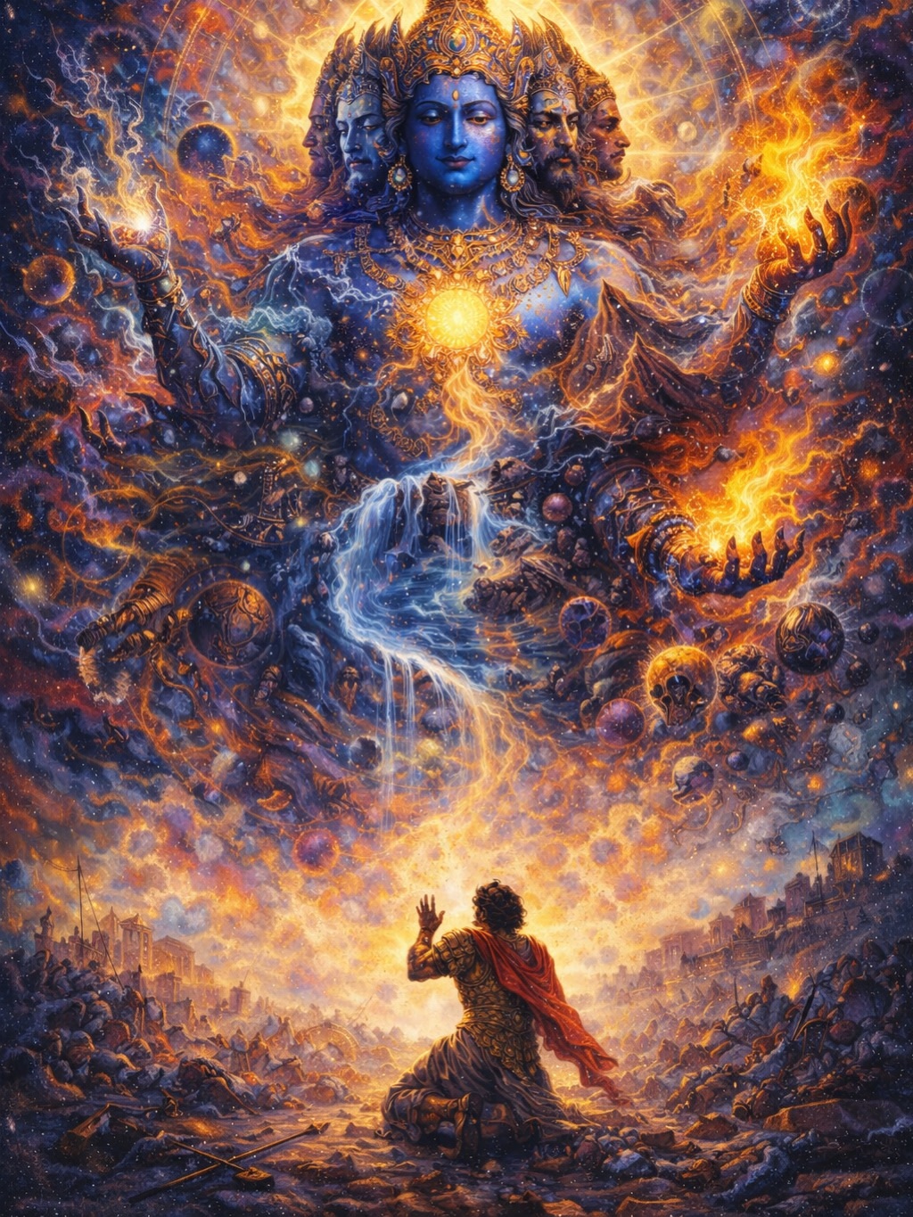 I mentioned that these arguments are presented by a god with Krishna serving as an avatar of Vishnu. It turns out that in The Gita, Krishna is more than “just” a god when he presents this argument. In the middle of the text, he reveals himself as the entirety of the universe: he is existence and non-existence, he is the physical reality and the natural forces that create and sustain life.
